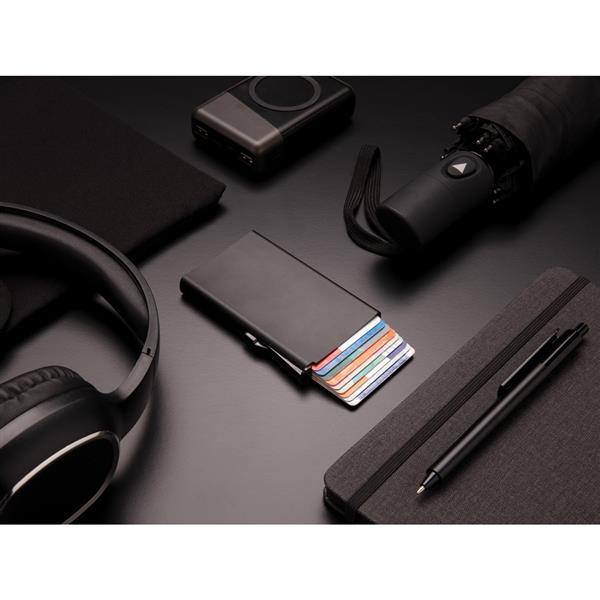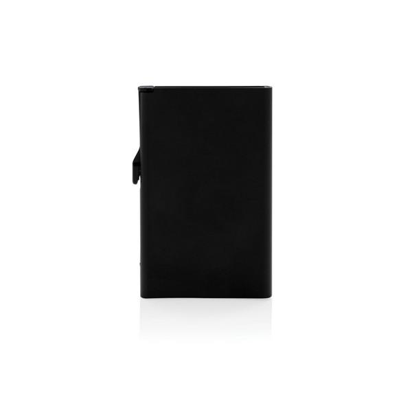 Etui na karty kredytowe z ochroną RFID, wykonane z wytrzymałego aluminium, mieści do 10 kart lub do 6 z tłoczeniem, posiada suwak boczny do wysuwania kart, ślad węglowy produktu: 0,67 kg CO2