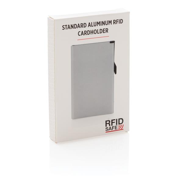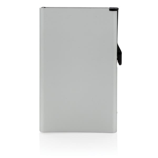 Etui na karty kredytowe z ochroną RFID, wykonane z wytrzymałego aluminium, mieści do 10 kart lub do 6 z tłoczeniem, posiada suwak boczny do wysuwania kart, ślad węglowy produktu: 0,67 kg CO2