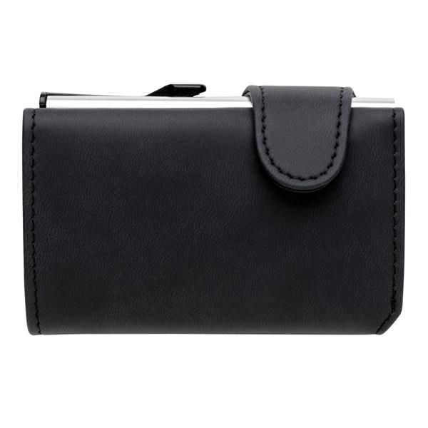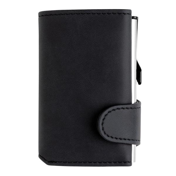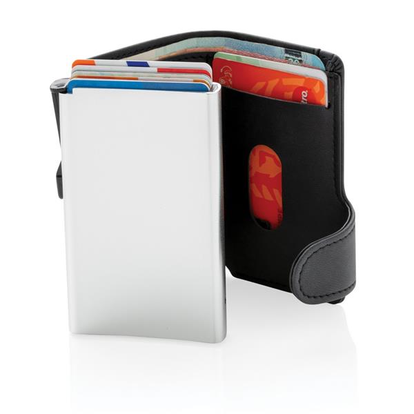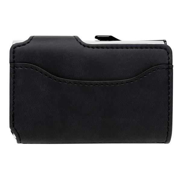 Etui na karty kredytowe, portfel z ochroną RFID, etui wykonane z wytrzymałego aluminium, portfel z PU, mieści do 10 kart lub do 6 z tłoczeniem, posiada suwak boczny do wysuwania kart, ślad węglowy produktu: 0,81 kg CO2