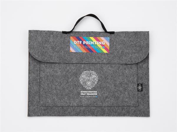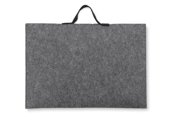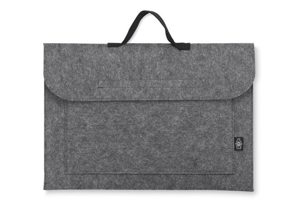 Stylowe etui na laptop TARO wykonane z recyklingowanego filcu rPET. Etui jest poręczne i lekkie mieszczące laptop 15”. Dodatkowa kieszeń umożliwia przechowywanie dokumantów, czy drobiazgów. Uchwyt ułatwia wygodne przenoszenie. Zamykane na rzep.