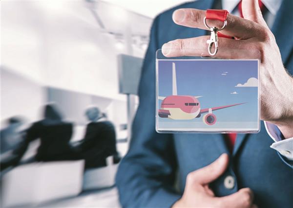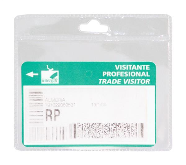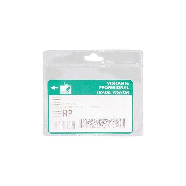 Transparentny, plastikowy uchwyt na wizytówki do zawieszenia na smyczy.