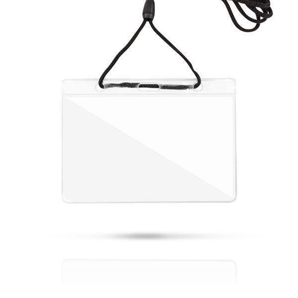 Etui na identyfikator ze sznurkiem. Rozmiar: 10,3 x 6,6 cm T3 (tampodruk): 4 x 3 S1 (sitodruk): 7 x 4 Kolor: przeźroczysty