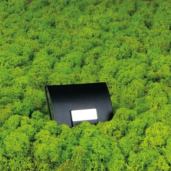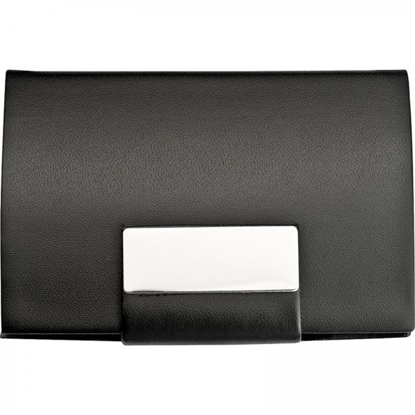 Etui na wizytówki wykonane z metalu i skóry ekologicznej z magnetycznym zapięciem.