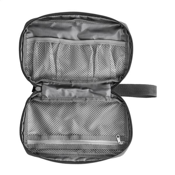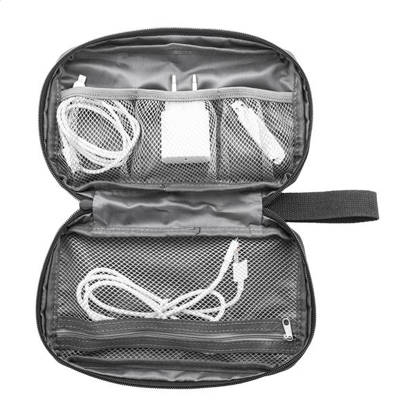 Zamykany na suwak organizer do kabli RPET z przegródkami z siateczki i kieszenią z przodu zapinaną na suwak. Poliester RPET 600D z charakterystyczną metką RPET.