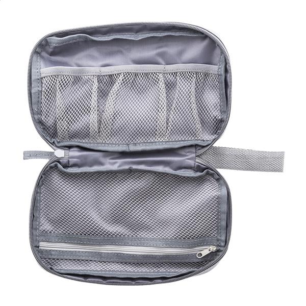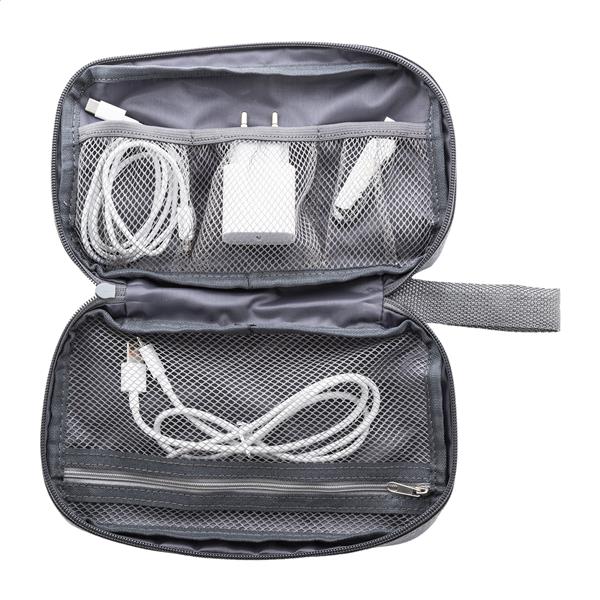 Zamykany na suwak organizer do kabli RPET z przegródkami z siateczki i kieszenią z przodu zapinaną na suwak. Poliester RPET 600D z charakterystyczną metką RPET.