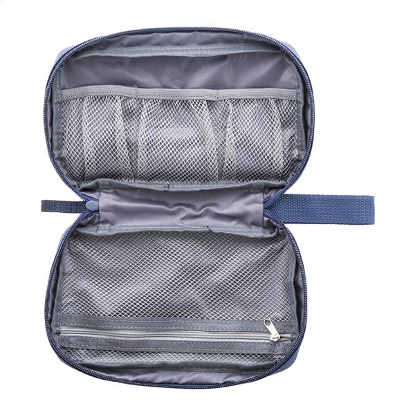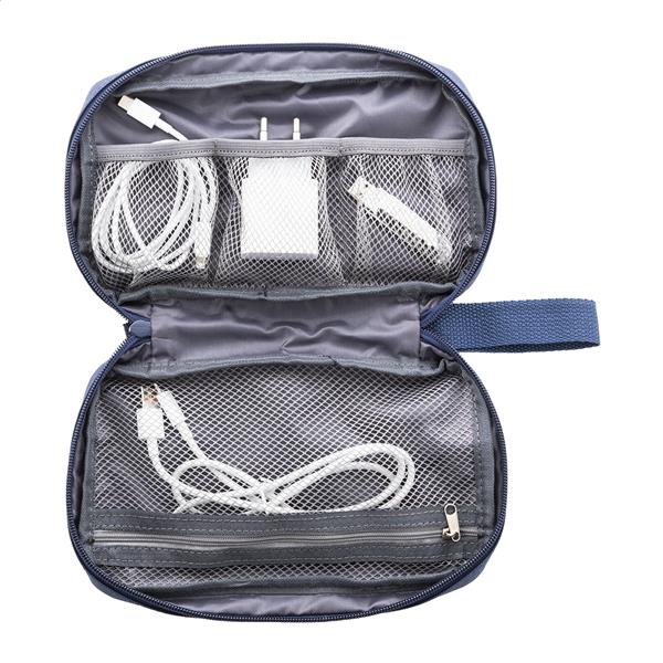 Zamykany na suwak organizer do kabli RPET z przegródkami z siateczki i kieszenią z przodu zapinaną na suwak. Poliester RPET 600D z charakterystyczną metką RPET.