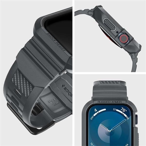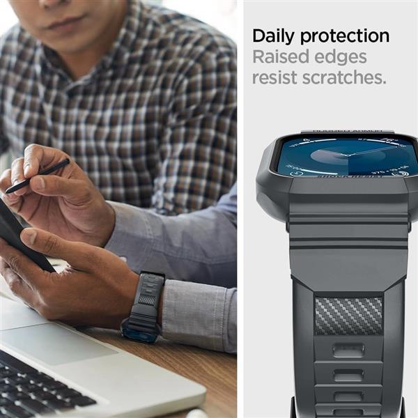 Wygodny pasek Spigen Rugged Armor Pro o sportowym zacięciu. Wykonany z elastycznego materiału TPU zdobionego akcentami z włókna węglowego. Posiada zintegrowaną obudowę z uwydatnionymi rantami, która pozwala na ochronę koperty zegarka przed zarysowaniami oraz uderzeniami. Pasek jest w pełni funkcjonalny i posiada możliwość regulacji według indywidualnych potrzeb.