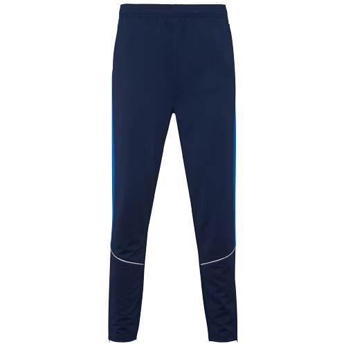 Dres z lekkiego i elastycznego materiału. Kurtka w kontrastowym kolorze z przeszyciami na klatce piersiowej. Wysoki kołnierz z kontrastowymi szwami. Zamek błyskawiczny po środku z przodu. Boczne kieszenie. Mankiety i talia wykończone ściągaczem 2×2. Spodnie z gumką w pasie i sznurkiem. Kontrastująca część z boku nogawki wykończona lamówką. Zamek błyskawiczny na dole nogawek.
