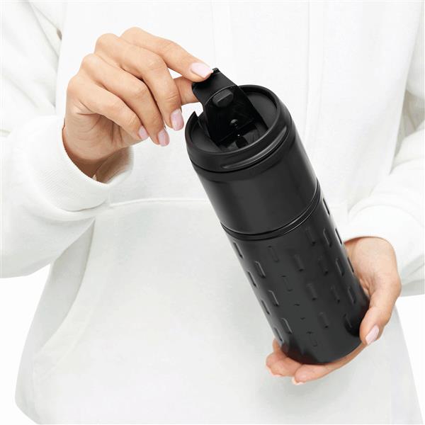 Kubek termiczny o podwójnych ściankach EXCLUSIVE LIQUID. Na zewnątrz stal nierdzewna o futurystycznym wzornictwie z silikonowym pierścieniem, wewnątrz plastik, odkręcana plastikowa pokrywa z wbudowanym, składanym otworem do picia, gumowany spód dla lepszej przyczepności, pojemność ok. 400 ml.