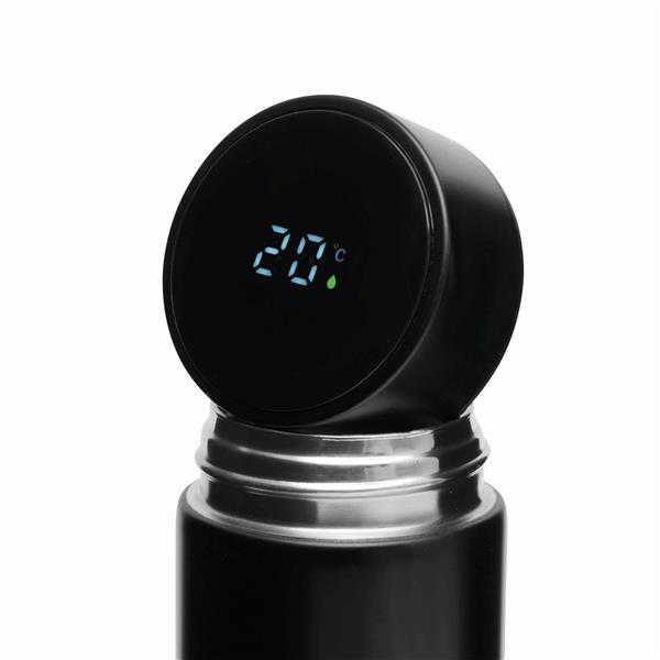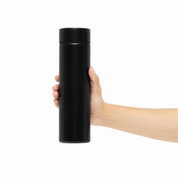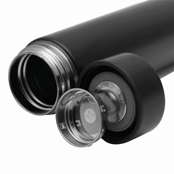 Termos próżniowy o podwójnych ściankach EXQUISITE. Wewnątrz i na zewnątrz ze stali nierdzewnej, z przykręcaną nakrętką ze zintegrowanym termometrem cyfrowym i z wyjmowanym zaparzaczem do herbaty. Pojemność ok. 500 ml. Wbudowana, niewymienna bateria. Materiał: Stal nierdzewna/PP/Silikon Kolor: czarny Tagi: Kubki/garnki izolowane,naczynia kuchenne,artykuły gospodarstwa domowego,kubki/garnki termiczne,akcesoria podróżne,dzbanki
