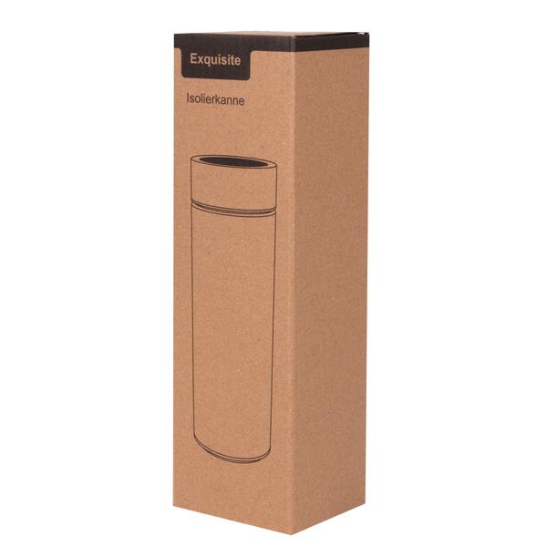 Termos próżniowy o podwójnych ściankach EXQUISITE. Wewnątrz i na zewnątrz ze stali nierdzewnej, z przykręcaną nakrętką ze zintegrowanym termometrem cyfrowym i z wyjmowanym zaparzaczem do herbaty. Pojemność ok. 500 ml. Wbudowana, niewymienna bateria.
