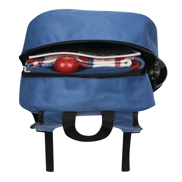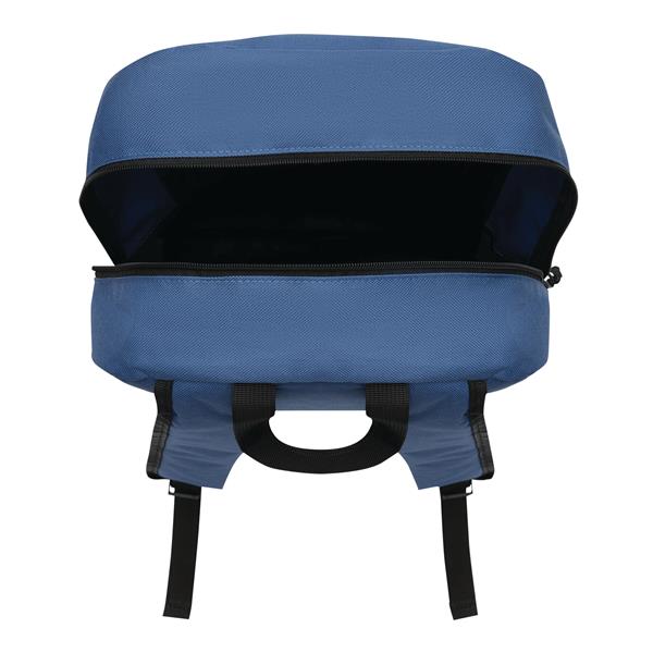 Plecak FARO. Wykonany jest z poliestru pochodzącego z recyklingu (rPET). Ma główną komorę zapinaną na zamek błyskawiczny, przednią kieszeń zapinaną na zamek błyskawiczny z regulowanym elastycznym sznurkiem, uchwyt do przenoszenia, 1 boczną kieszeń z siatki, wyściełane dno oraz regulowane wyściełane paski na ramię.