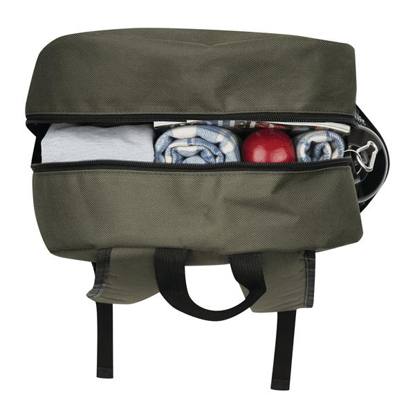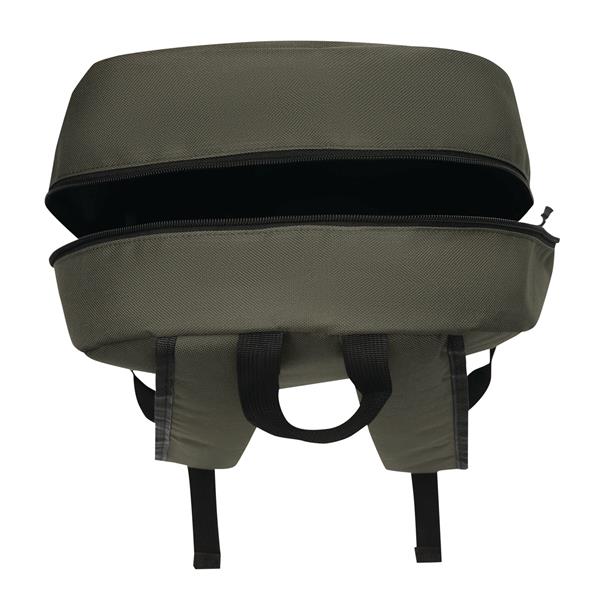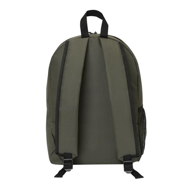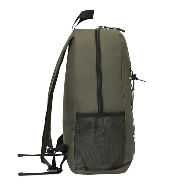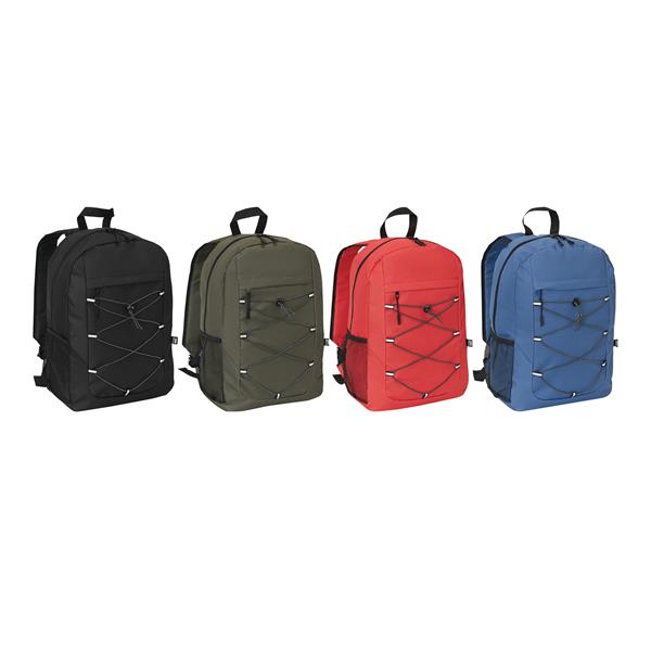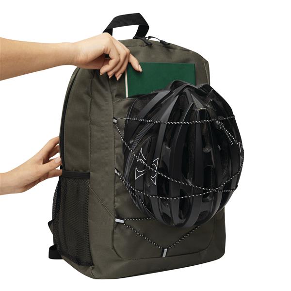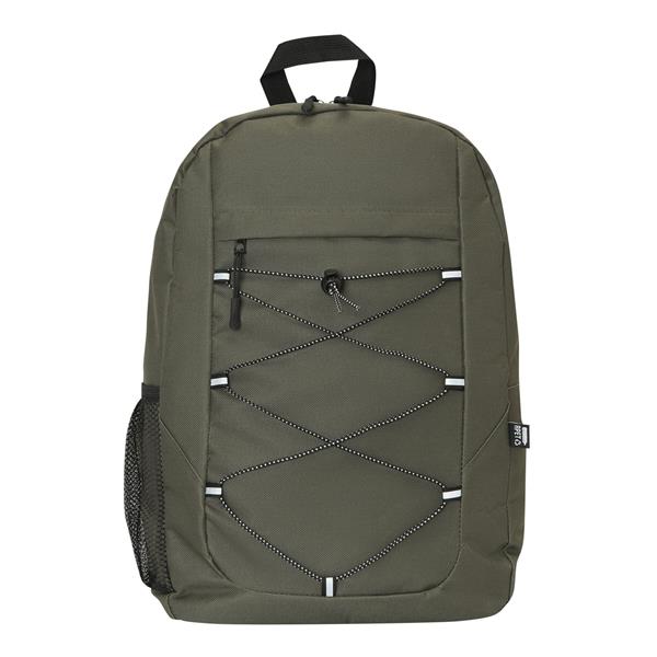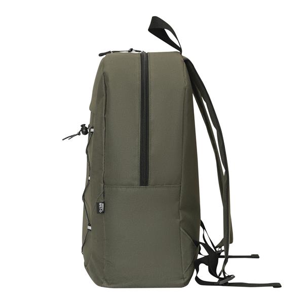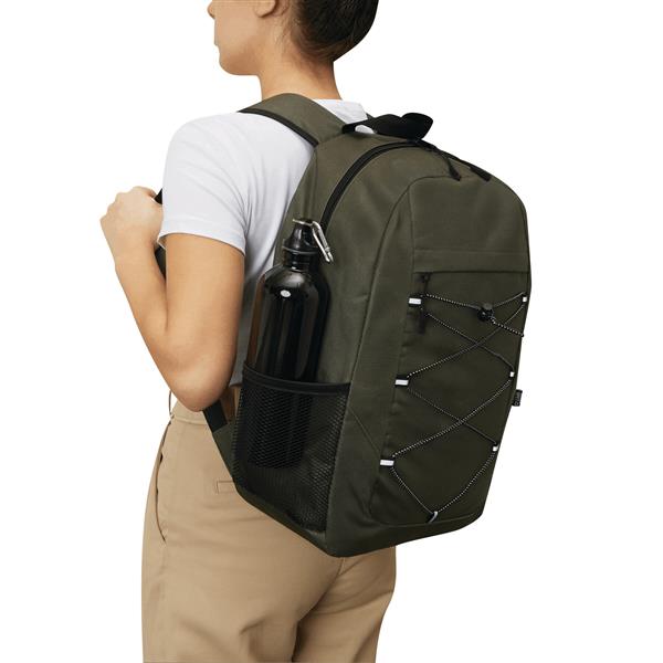Plecak FARO. Wykonany jest z poliestru pochodzącego z recyklingu (rPET). Ma główną komorę zapinaną na zamek błyskawiczny, przednią kieszeń zapinaną na zamek błyskawiczny z regulowanym elastycznym sznurkiem, uchwyt do przenoszenia, 1 boczną kieszeń z siatki, wyściełane dno oraz regulowane wyściełane paski na ramię.