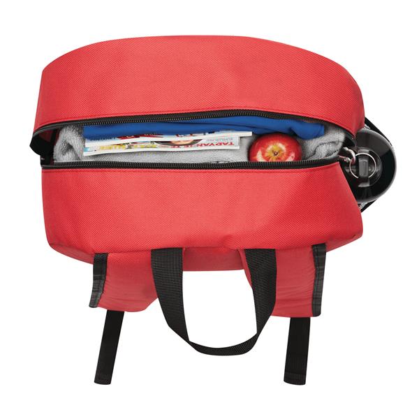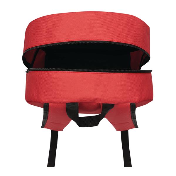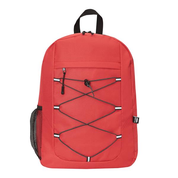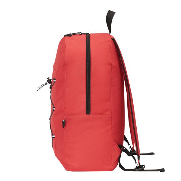 Plecak FARO. Wykonany jest z poliestru pochodzącego z recyklingu (rPET). Ma główną komorę zapinaną na zamek błyskawiczny, przednią kieszeń zapinaną na zamek błyskawiczny z regulowanym elastycznym sznurkiem, uchwyt do przenoszenia, 1 boczną kieszeń z siatki, wyściełane dno oraz regulowane wyściełane paski na ramię.