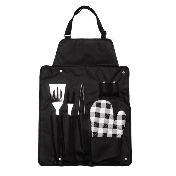 Nylonowy fartuch grillowy z 7-elementowym wyposażeniem. Wykonany z metalu oraz nylonu.