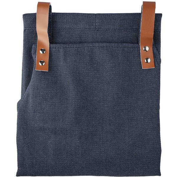 Fartuch kuchenny z denimu, do noszenia na ramionach poprzez włożenie pasków w dołączone szlufki z boku, 2 przednie kieszenie z przodu, zapakowany w brązowy kartonik, produkt wykonany z denimu, bawełny 65%/35%, poliestru o gramaturze 280 g/m2