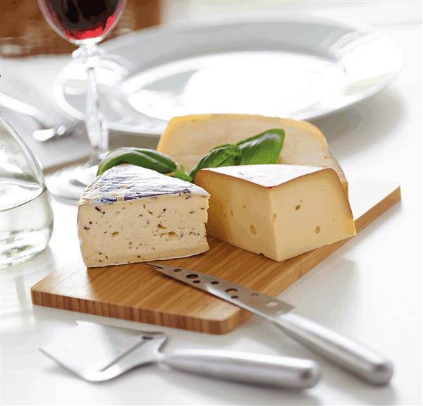 Zestaw do sera FESCO składa się z trzech elementów: noża do sera, krajalnicy i deski do krojenia z bambusa.