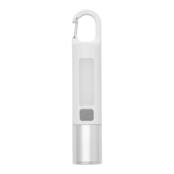 Akumulatorowa latarka LED – FLOODLIGHT. Przednia dioda LED ma 2 tryby świecenia (światło ciągłe i migające) oraz regulowany strumień światła. Wyposażona w boczny panel świetlny z 7 diodami LED, silikonowy włącznik/wyłącznik oraz karabińczyk do przypięcia (karabińczyk NIE nadaje się do wspinaczki). Ma wydajny akumulator litowy o pojemności 800 mAh. W zestawie jest kabel do ładowania USB z wtyczką typu C (długość ok. 30 cm). Zapakowana jest w pudełko.