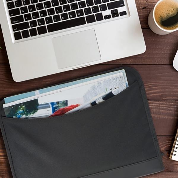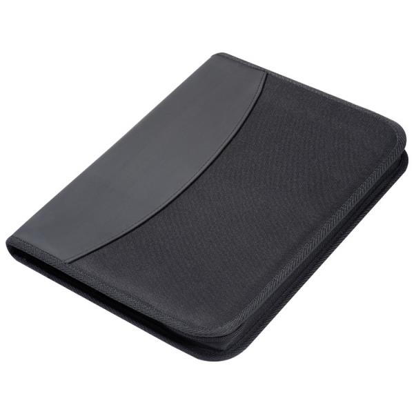 Teczka w formacie A4 wykonana z poliestru i tworzywa PU, zamykana na zamek. Teczka zawiera dodatkową przegródkę z tyłu, kilka przegród w środku oraz 20-kartkowy notatnik.