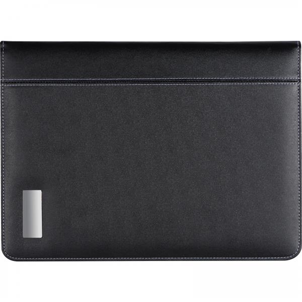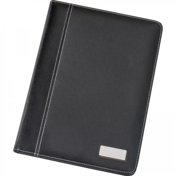 Folder A4 z materiału imitującego skórę. Posiada liczne przegródki, kieszeń i podstawkę pod telefon, miejsce na długopis oraz notes w linie z małym kalendarzem.