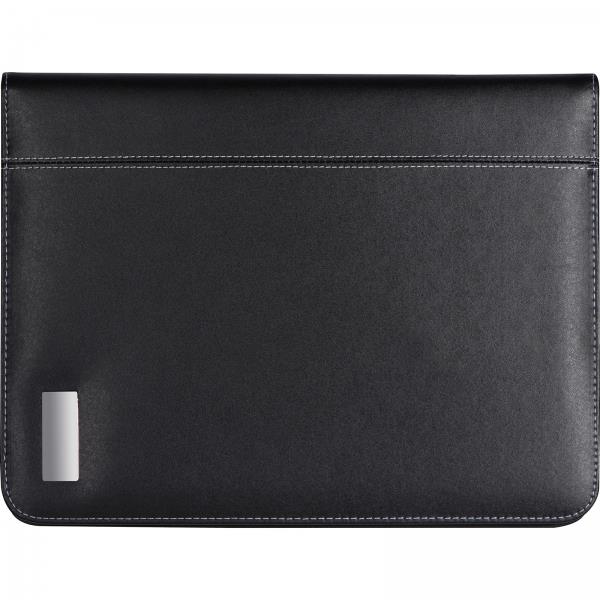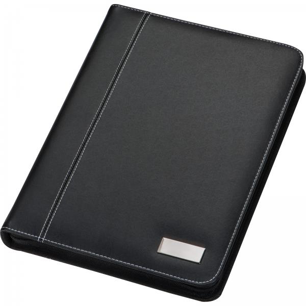Folder A4 z materiału imitującego skórę. Posiada kieszeń na tablet, kieszenie na wizytówki, kieszeń i podstawkę pod telefon, szlufki na długopisy oraz notes w linie z małym kalendarzem. Zamykany na zamek błyskawiczny.