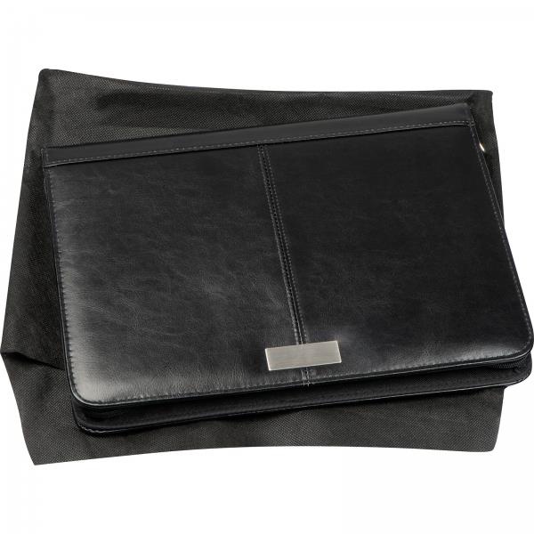 Folder A4 z materiału imitującego skórę. Posiada kieszeń na tablet, liczne przegródki, kieszeń i podstawkę pod telefon, miejsce na długopisy oraz notes w linie z małym kalendarzem.