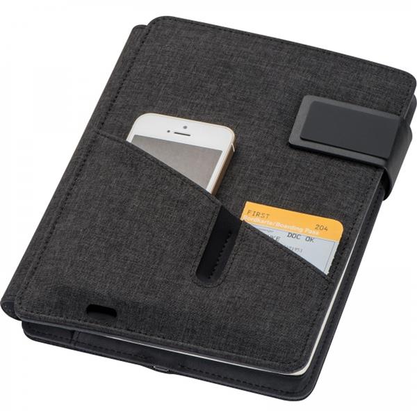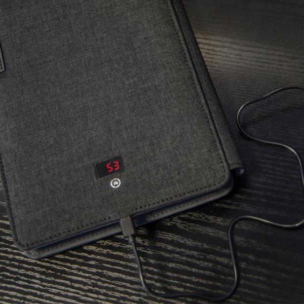 Notatnik z PU i poliestru, formatu A5 w linie (128 stron) z power bankiem o pojemności 4000 mAh. Dane techniczne: Typ baterii: litowo-polimerowa Pojemność baterii: 4000 mAh Input: 1A, 5V Output: 2.1A, 5V Użytkowanie: 0-40 stopni C / 32-104 stopni F Transport i przechowywanie: -10 do 50C / -4 do 122F Inne: Kabel posiada złącza USB A i mikro USB. Kabel do ładowania folderu (zamieszczny pod notesem): 3w1 (lighting, typ C, mikro USB) Notes posiada 128 stron