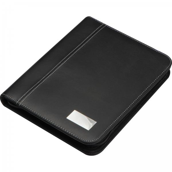 Folder A5 z materiału imitującego skórę. Posiada kieszenie na wizytówki, telefon i szlufki na długopisy oraz notes w linie z małym kalendarzem. Zamykany na zamek błyskawiczny.