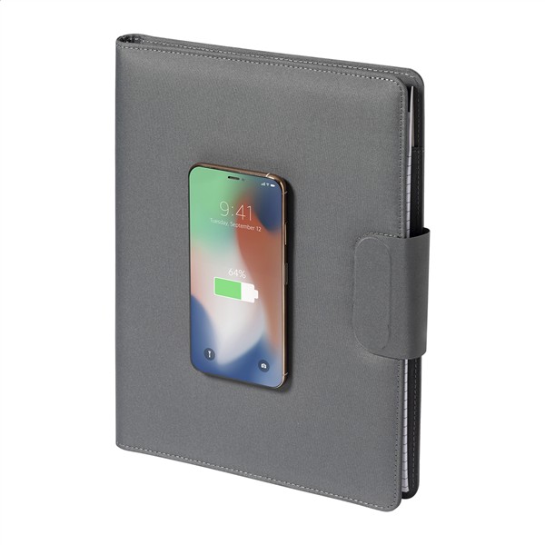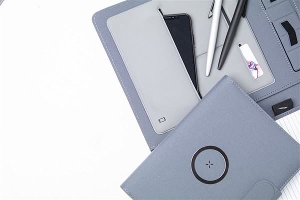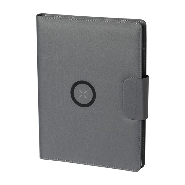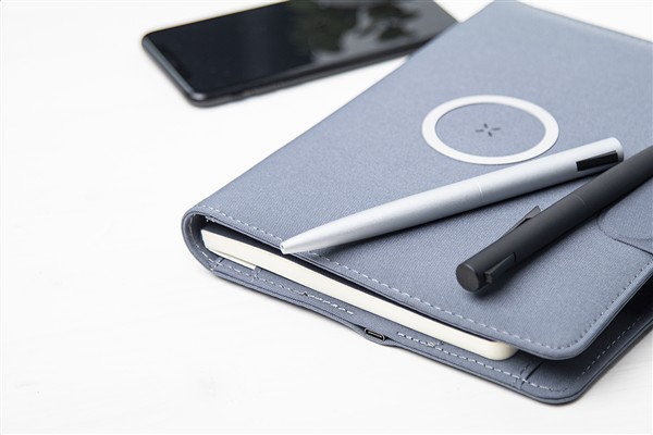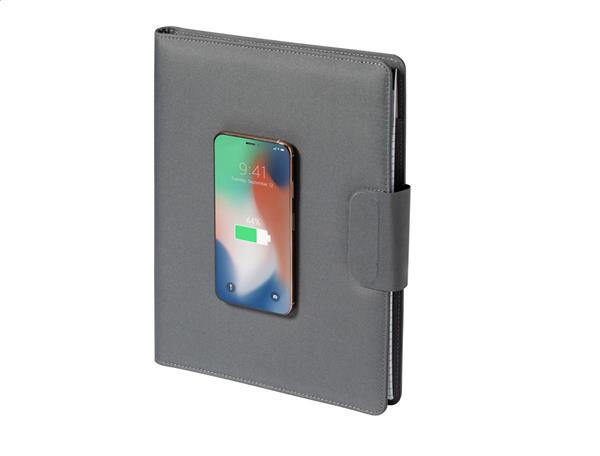 Teczka na dokumenty w formacie A4 wykonana z poliestru 300D RPET z wbudowaną magnetyczną szybką ładowarką indukcyjną (10 W), power bankiem 5000 mAh z portem ładowania USB, składanym uchwytem na telefon komórkowy i notatnikiem na 20 kartek w linie. W zestawie samoprzylepny metalowy pierścień do korzystania z funkcji magnetycznej na dowolnym urządzeniu ładowanym bezprzewodowo. W zestawie kabel do ładowarki USB.
