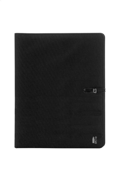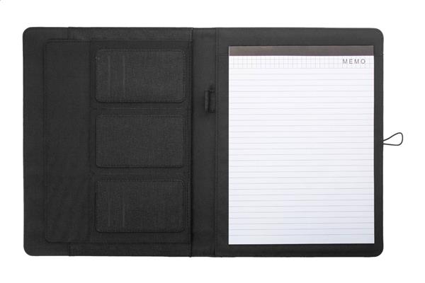 Teczka na dokumenty formatu A4 wykonana z poliestru 300D RPET z notatnikiem 25 kartek w linie i wieloma wewnętrznymi kieszeniami z organizerem.