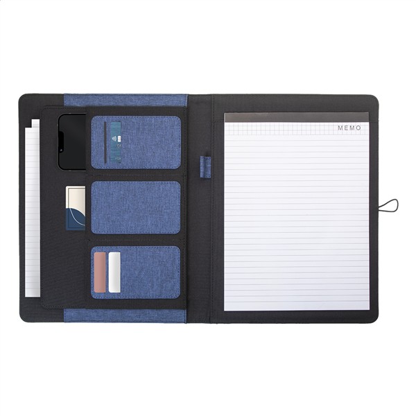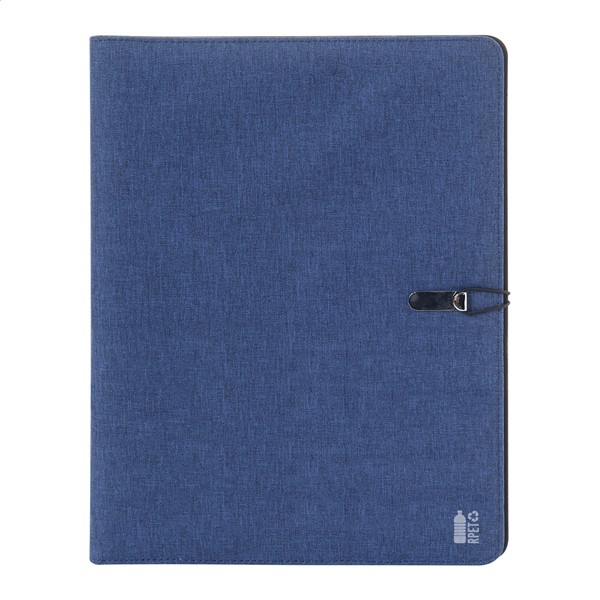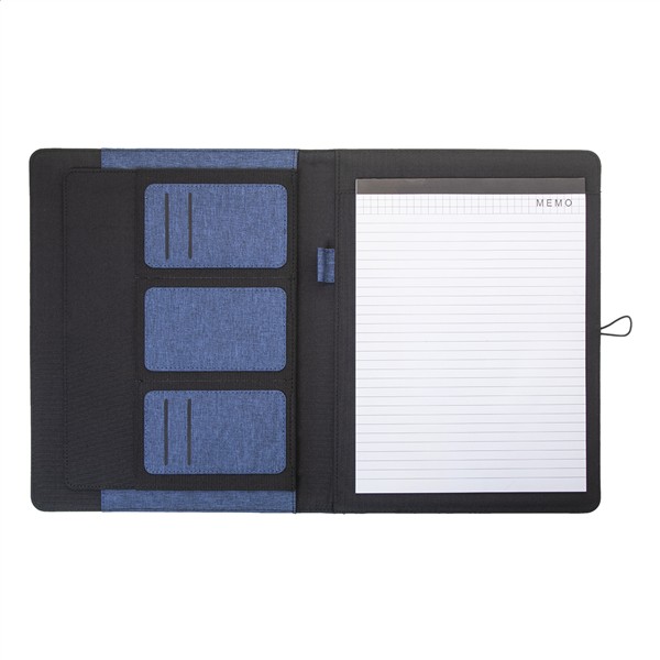 Teczka na dokumenty formatu A4 wykonana z poliestru 300D RPET z notatnikiem 25 kartek w linie i wieloma wewnętrznymi kieszeniami z organizerem.