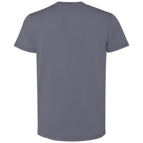 Męska koszulka z krótkim rękawem. Wykończenie uzyskane dzięki poddaniu działaniu wybielacza w celu uzyskania smug lub odbarwień. Okrągły dekolt wykończony prążkowanym ściągaczem 1×1. Ścieg kryty ton w ton z wykończeniem na wysoki połysk.