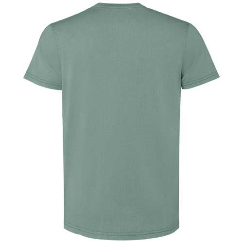 Męska koszulka z krótkim rękawem. Wykończenie uzyskane dzięki poddaniu działaniu wybielacza w celu uzyskania smug lub odbarwień. Okrągły dekolt wykończony prążkowanym ściągaczem 1×1. Ścieg kryty ton w ton z wykończeniem na wysoki połysk.
