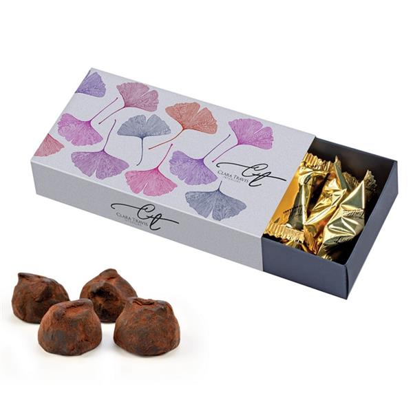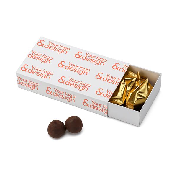 Każde opakowanie posiada certyfikat FSC, a jego szatę graficzną można w pełni spersonalizować. Dodaj swoje logo, unikalny wzór graficzny lub dedykację, aby stworzyć niezapomniany upominek. Każda trufla znajdująca się w opakowaniu jest zabezpieczona folią.