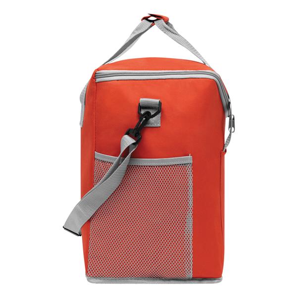 Torba izotermiczna FROSTY, 1 wsuwana kieszeń z przodu, izolowana komora główna zamykana na zamek, 2 siatkowe kieszonki po bokach, uchwyty do przenoszenia z paskiem wzmacniającym na rzep, regulowany, odpinany pasek na ramię – idealna na piknik, grill i podróże.