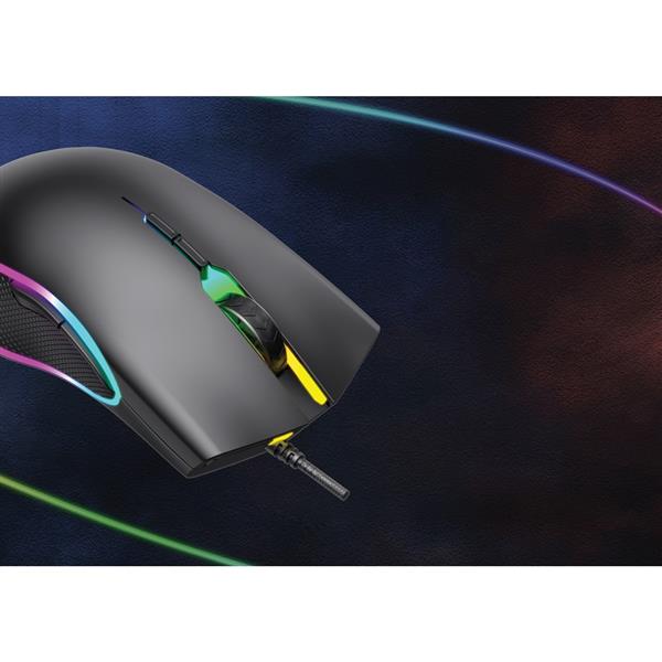 Gamingowa mysz komputerowa RGB, wykonana z ABS, wysoka rozdzielczość do 7200 DPI, wbudowane podświetlenie RGB z 15 trybami świecenia, posiada 4 przyciski oraz rolkę do przewijania, pleciony kabel o długości 180 cm, plug and play – nie wymaga instalacji sterownika, kompatybilna z systemami Windows 2000/XP/Vista/Windows 7, 8 i 10/Linux/Mac, nie zawiera PVC, ślad węglowy produktu: 1,23 kg CO2