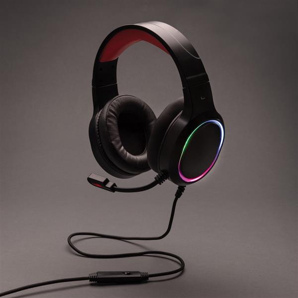 Gamingowe słuchawki nauszne RGB, regulowana, wygodna konstrukcja, wbudowany mikrofon wysokiej jakości, tryb niskich opóźnień, wbudowane podświetlenie RGB z 15 trybami świecenia, plug and play – nie wymaga instalacji sterownika, kabel o długości 180 cm, nie zawiera PVC, ślad węglowy produktu: 2,99 kg CO2