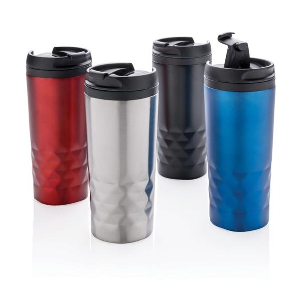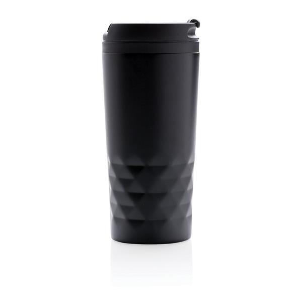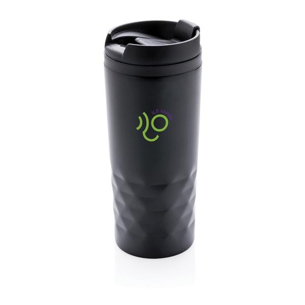 Geometryczny kubek termiczny 300 ml, plastikowe wnętrze, stal nierdzewna na zewnątrz, wyłącznie mycie ręczne, utrzymuje temperaturę napojów gorących do 4 godzin