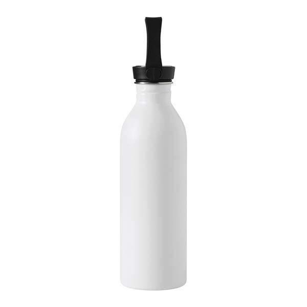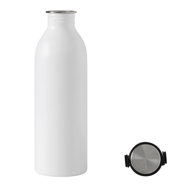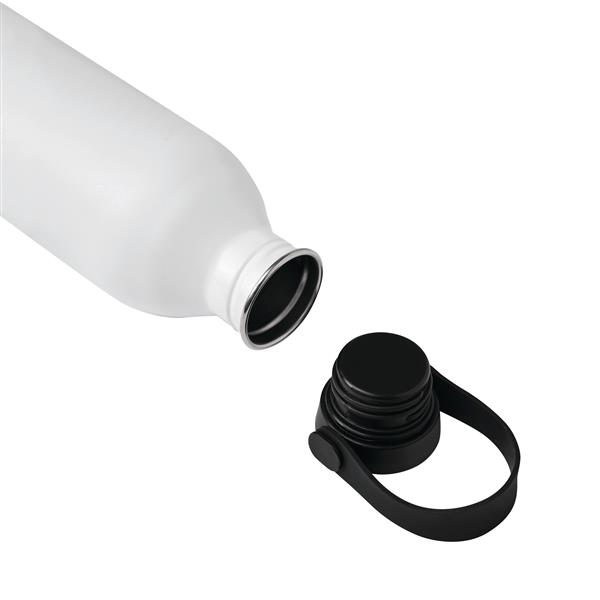 Butelka GET REFRESH, z matową powłoką proszkową. Ma plastikową pokrywę z bezpieczną zakrętką, której górna powierzchnia wykonana jest ze stali nierdzewnej. Posiada silikonowy pasek do przenoszenia. Pojemność butelki to ok. 550 ml.
