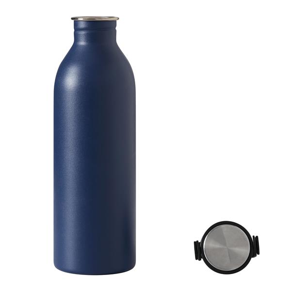 Butelka GET REFRESH, z matową powłoką proszkową. Ma plastikową pokrywę z bezpieczną zakrętką, której górna powierzchnia wykonana jest ze stali nierdzewnej. Posiada silikonowy pasek do przenoszenia. Pojemność butelki to ok. 550 ml.