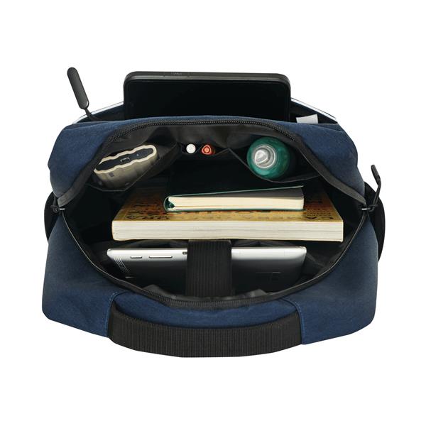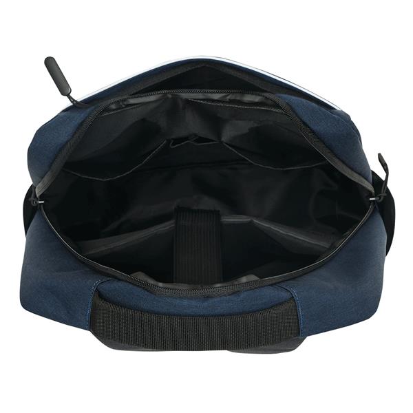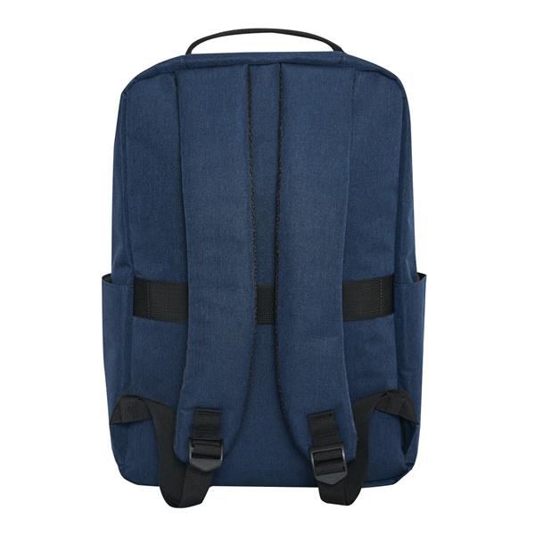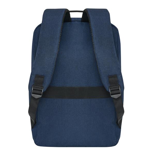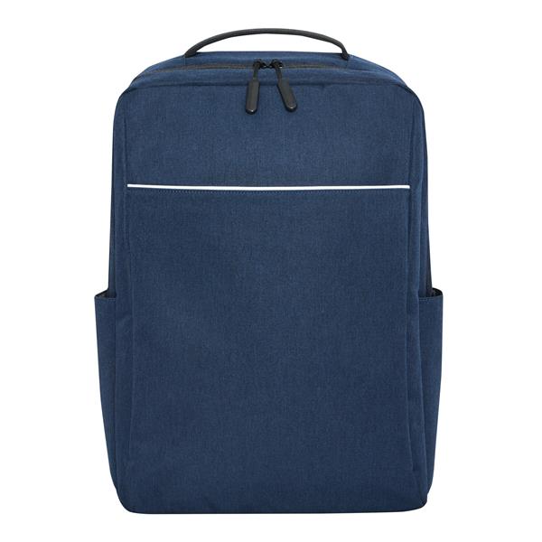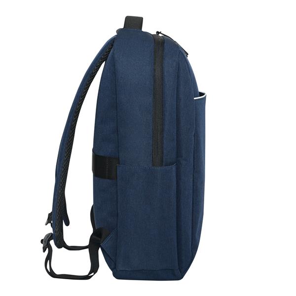 Plecak GHENT. Wykonany jest z poliestru pochodzącego z recyklingu (rPET). Ma 1 przednią kieszeń na zamek z odblaskową wstawką, komorę główną na zamek z wyściełaną kieszenią na laptopa lub tablet, organizer z 4 wsuwanymi kieszeniami, 2 boczne wsuwane kieszenie, wyściełany uchwyt do przenoszenia, wyściełane i regulowane szelki oraz pasek do mocowania na uchwycie walizki.