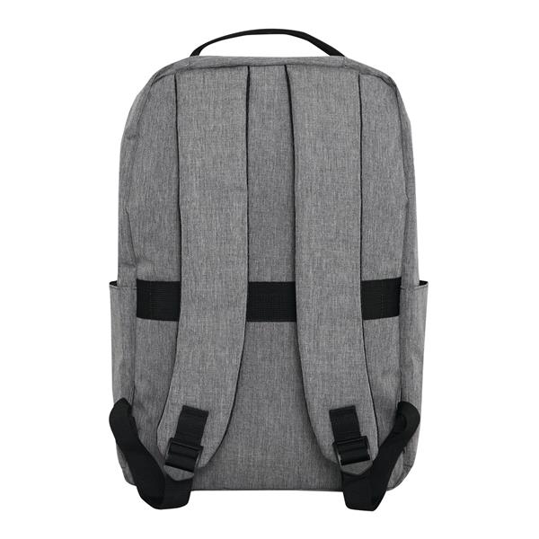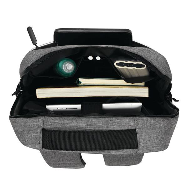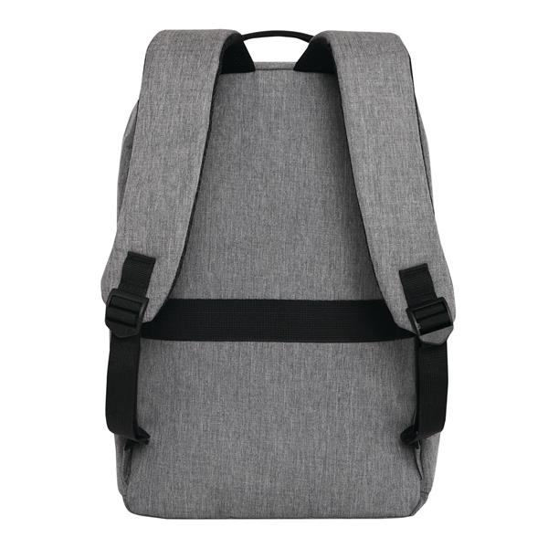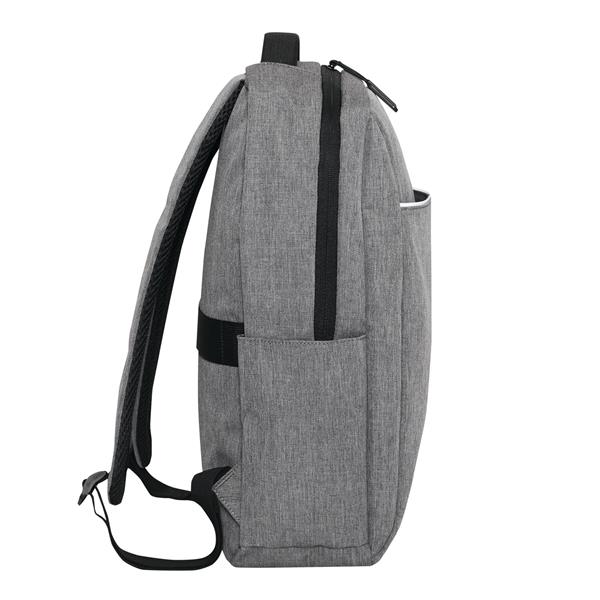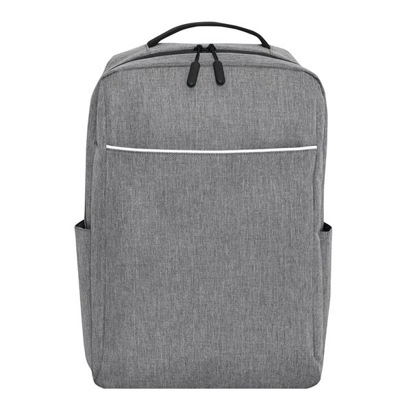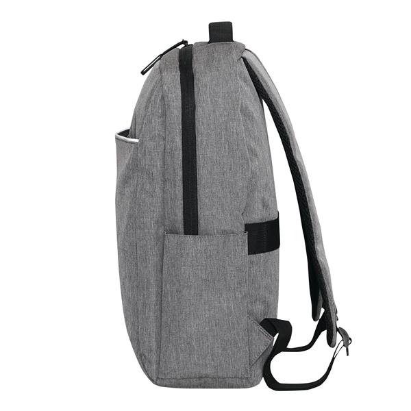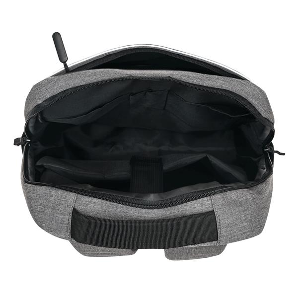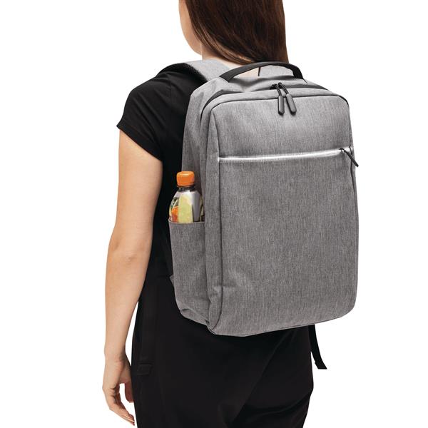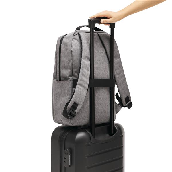 Plecak GHENT. Wykonany jest z poliestru pochodzącego z recyklingu (rPET). Ma 1 przednią kieszeń na zamek z odblaskową wstawką, komorę główną na zamek z wyściełaną kieszenią na laptopa lub tablet, organizer z 4 wsuwanymi kieszeniami, 2 boczne wsuwane kieszenie, wyściełany uchwyt do przenoszenia, wyściełane i regulowane szelki oraz pasek do mocowania na uchwycie walizki.