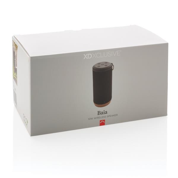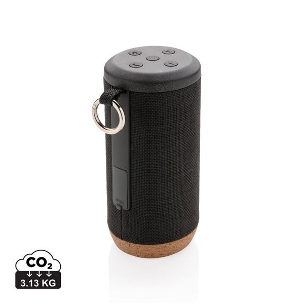 Głośnik bezprzewodowy 10W, BT 4.2, wodoodporny IPX5 (całkowita ochrona przed strumieniem wody płynącej z różnych kierunków z wydajnością do 12,5 litra na minutę), wykonany z wytrzymałej tkaniny, spód z organicznego korka, akumulator o pojemności 2000 mAh umożliwia odtwarzanie muzyki do 6 godzin, zasięg do 10 m, w trosce o środowisko naturalne opakowanie głośnika nie zawiera plastiku, wzór zastrzeżony®, ślad węglowy produktu: 3,13 kg CO2