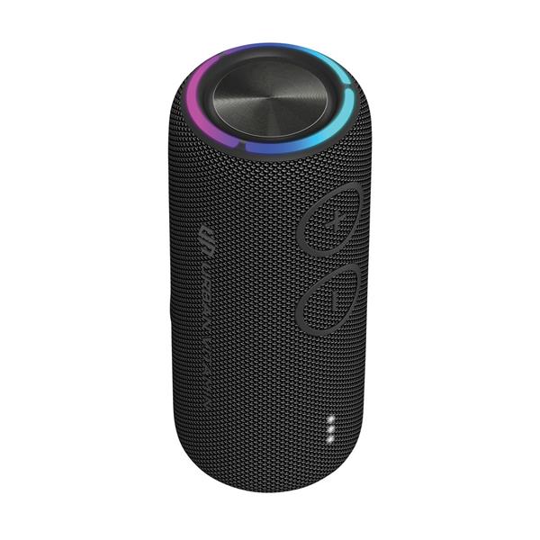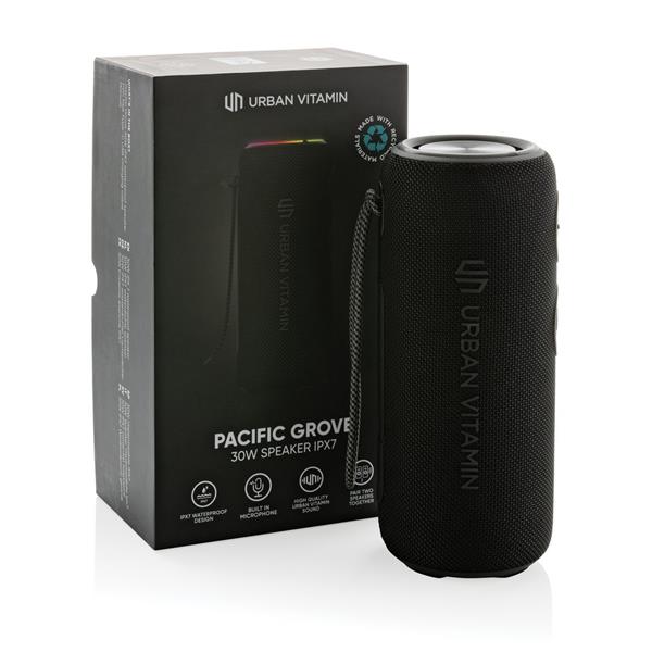 Głośnik bezprzewodowy 30 W, wodoodporny IPX7 (odporność do 1m na czas do 30 minut), uchwyt, 2 głośniki niskotonowe, możliwość sparowania dwóch głośników w celu uzyskania dźwięku stereo, do 8 godzin odtwarzania na jednym ładowaniu, wykonany z ABS i PET z recyklingu z certyfikatem RCS, całkowita zawartość materiałów obliczona na podstawie wagi całkowitej przedmiotu: 36%, ślad węglowy produktu: 0 kg CO2