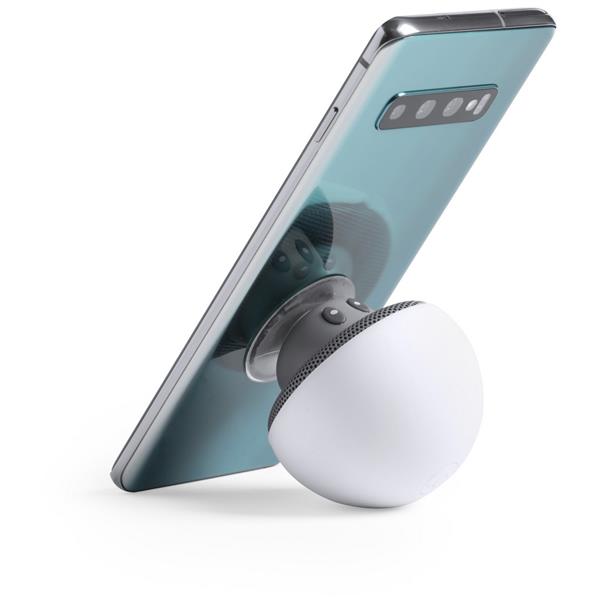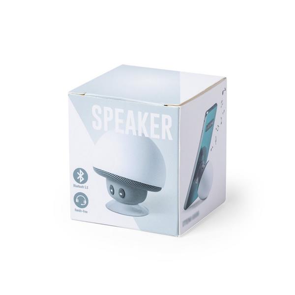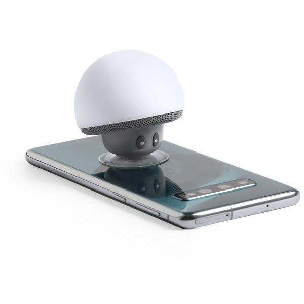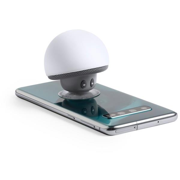 Głośnik bezprzewodowy „grzybek” BT 5.0 3W, może służyć także jako stojak na telefon, bateria 200 mAh, posiada funkcję odbierania połączeń, wbudowany mikrofon, zasięg do 10 m, ładowany przez USB, kabel micro USB w komplecie