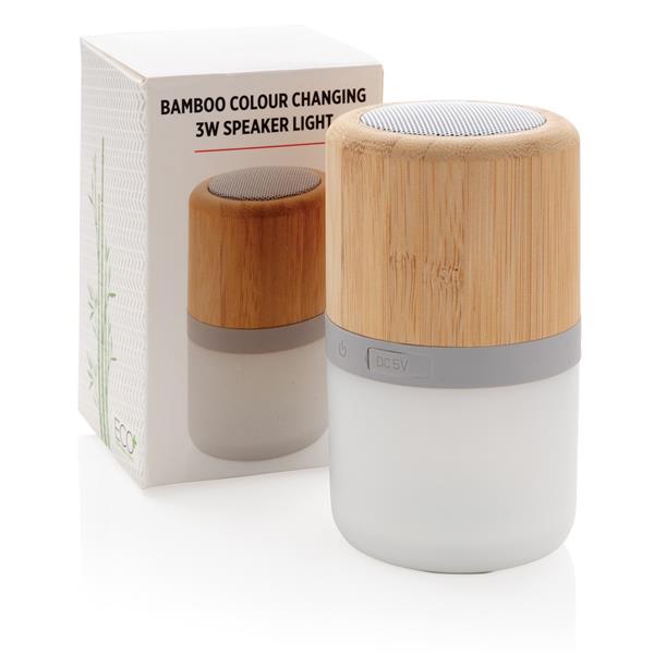 Głośnik bezprzewodowy 3W, BT 5.0, lampka, 4 tryby oświetlenia, wykonany z naturalnego bambusa, w pełni naładowany akumulator o pojemności 400 mAh umożliwia odtwarzanie muzyki do 3 godzin w zależności od używania, ponowne naładowanie w 2 godziny, kabel micro USB bez dodatku PVC w komplecie, ślad węglowy produktu: 3,04 kg CO2