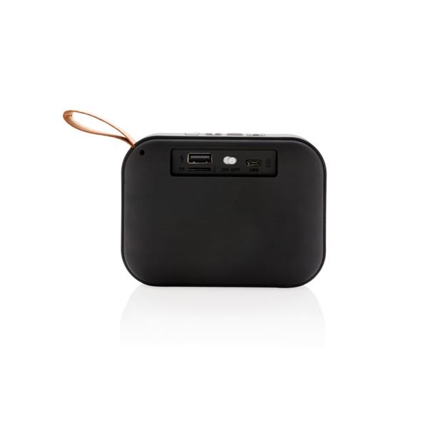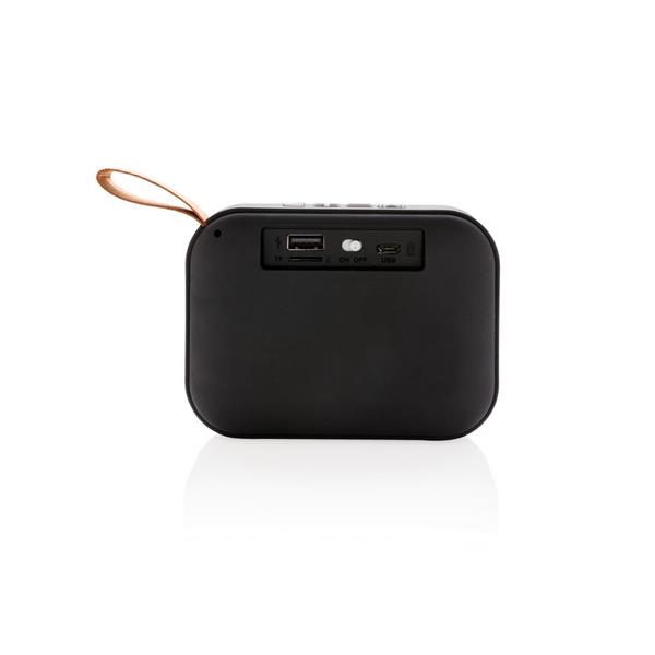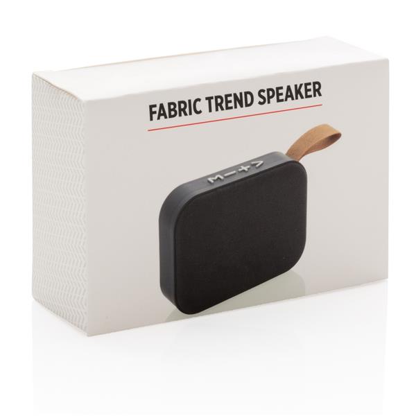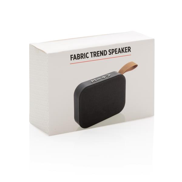 Głośnik bezprzewodowy 3W, BT 5.0, obudowa wykonana z miękkiego w dotyku ABS i tkaniny, gumowe paski w dolnej części urządzenia poprawiające stabilność i jakość dźwięku, w pełni naładowany akumulator o pojemności 300 mAh umożliwia odtwarzanie muzyki do 3 godzin, głośnika można używać również za pomocą kabla audio, kompatybilny ze wszystkimi rodzajami telefonów, kable audio i micro USB do ładowania w komplecie, zasięg do 10 m, ślad węglowy produktu: 2,04 kg CO2