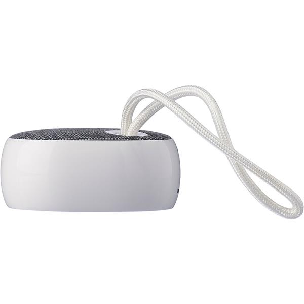 Głośnik bezprzewodowy BT 5.3, 3W, bateria 300 mAh, zasięg: 10 m, sznurek ułatwiający noszenie, biały kabel USB 30 cm w komplecie, ikona RPET na tkaninie, ikona recyklingu na produkcie, zapakowany w brązowe kartonowe pudełko, produkt wykonany z ABS i RPET
