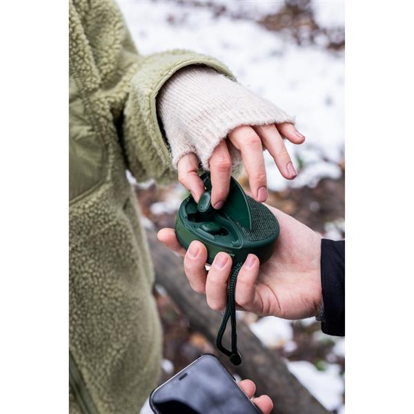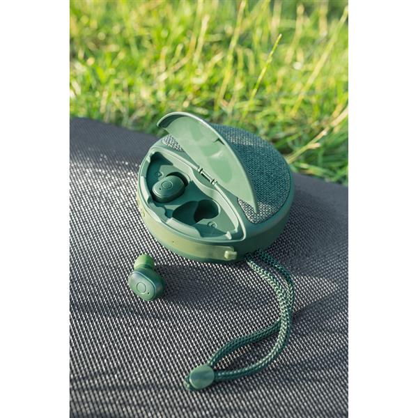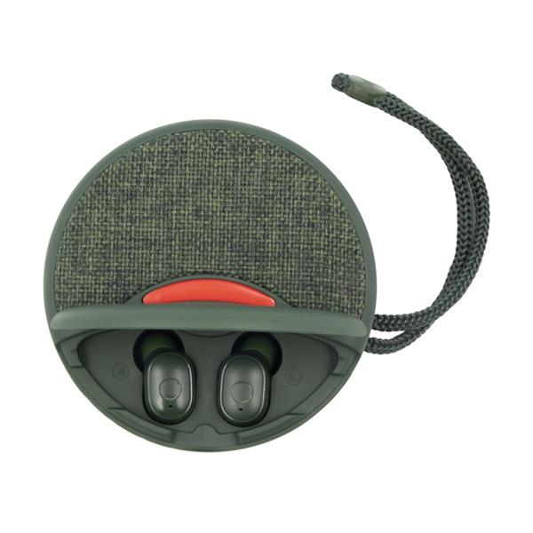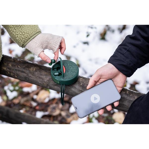 Głośnik bezprzewodowy 5W Air Gifts z bezprzewodowymi słuchawkami dousznymi w komplecie, BT 5.0, posiada radio, czytnik kart TF/micro SD (nie dołączona), słuchawki z funkcją odbierania połączeń, bateria głośnika: 500 mAh, bateria słuchawek: 2×40 mAh, czas pracy słuchawek: ok. 3h, zasięg do 10 m, gniazdo USB, wejście audio, wejście USB-C, ładowany przez USB, kabel USB-C w komplecie