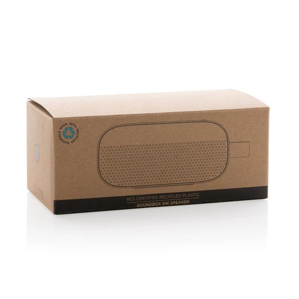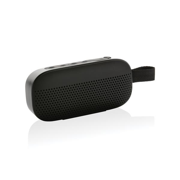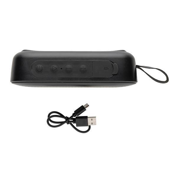 Głośnik bezprzewodowy 5W BT5.3, wodoodporny IPX5 (całkowita ochrona przed strumieniem wody płynącej z różnych kierunków z wydajnością do 12,5 litra na minutę), wbudowany mikrofon, funkcja odbierania połączeń, wbudowany akumulator o pojemności 1200 mAh pozwala na odtwarzanie muzyki do 6 godzin, zasięg do 10 m, wykonany z ABS z recyklingu z certyfikatem RCS, całkowita zawartość materiałów z recyklingu obliczona na podstawie wagi całkowitej przedmiotu: 36%, kabel z TPE z recyklingu w komplecie, w pudełku z papieru kraftowego z certyfikatem FSC® mix, ślad węglowy produktu: 2,63 kg CO2